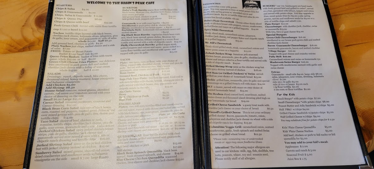 Hahn's Peak Cafe offers a varied menu with something for every palate. For starters, guests can enjoy Chips & Salsa, Chips & Guacamole, Chips & Queso Dip, or opt for the heartier Chips & Queso With Beef or Chips, Salsa & Guacamole. Salads include fresh options like the House Salad, Caesar Salad, and the unique Black Bean Corn Salad. For a more filling dish, their burritos are a hit, featuring the Hahn's Peak Burrito, Big Black Bean Burrito, and the savory Philly Cheesesteak Burrito. Taco lovers will appreciate the Baja Fish Taco Plate. The sandwich selection includes a variety of cheesesteaks, such as the classic Hahn's Peak Cheesesteak, the spicy Spicy Nikki Cheesesteak, and the hearty Mr. Bill's Cheesesteak, along with wraps like the Jerked Chicken Wrap and Jerked Shrimp Wrap. The cafe also features special burgers, including the Green Chili Cheeseburger, Bacon-Guacamole Cheeseburger, Village Burger, and the classic Patty Melt. For kids, options like the Small Burger, Small Cheeseburger, and Grilled Cheese Sandwich W/Potato Chips make for simple, tasty meals. Other intriguing options include the Finnoff's Grilled Cheese, the Columbine Veggie Grill, and dishes like Red Sauce With Ground Beef or Spinach and Fela With Red Sauce. Whether you're in the mood for a light snack or a filling meal, Hahn's Peak Cafe delivers an impressive variety of dishes at reasonable prices.
